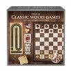 Beautiful, natural wood veneer finish • Real wood pieces • Urea domiones • Flocked inner tray holds and stores all your pieces after play.