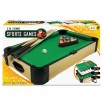 Rack 'em up with Tabletop Billiards. This mini-size Billiards table features a convenient ball return system, quality wooden exterior, billiard balls and wooden cue sticks giving the experience and authenticity of a full-size Billiard table.