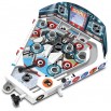 1 Stadium, 3 Hockey puck styled pawns, 1 Stick, 2 Metal balls, 1 Backboard, 1 Sticker sheet with all 31 NHL® team logos, Instructions.